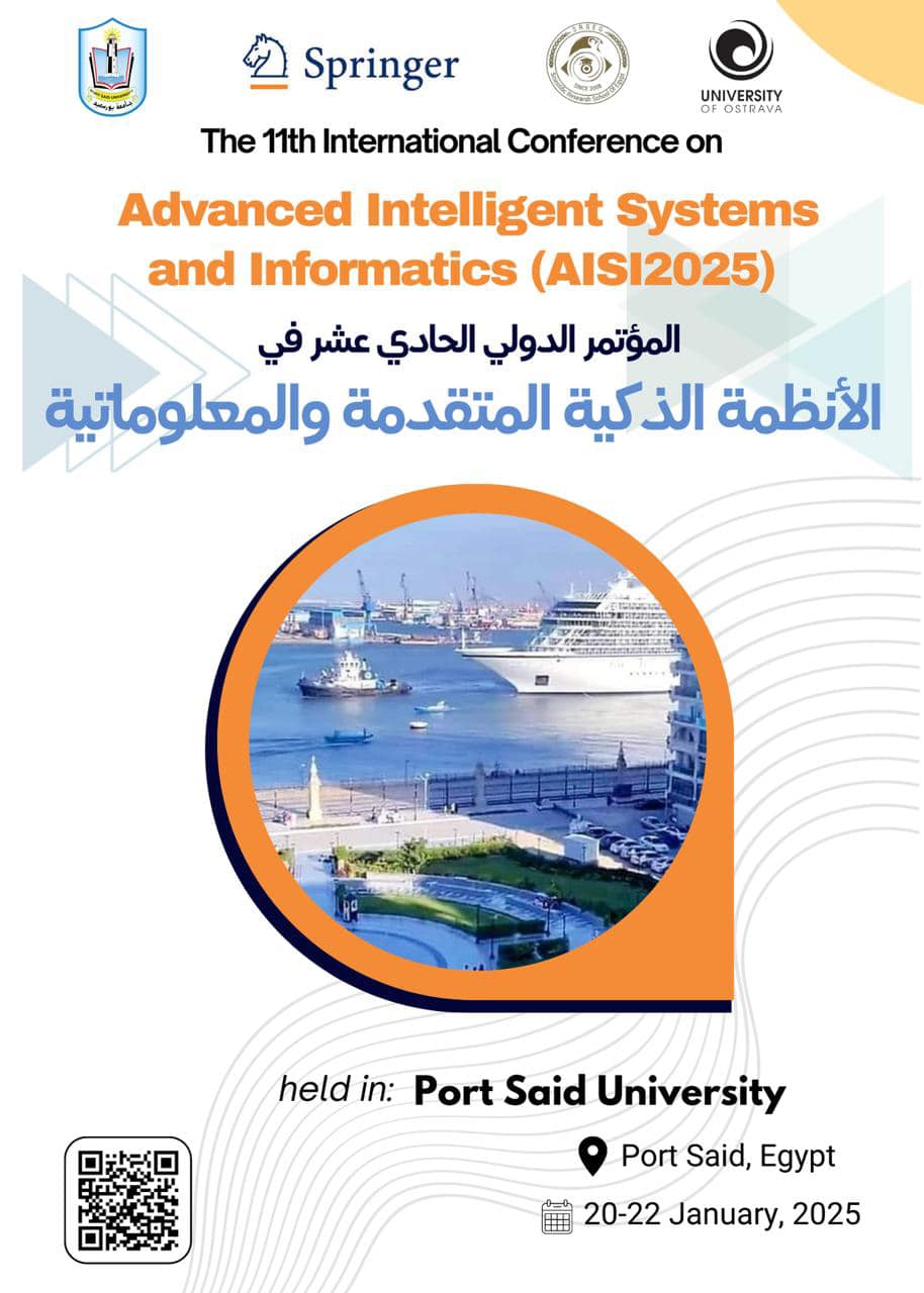 دعوة لحضور المؤتمر الدولي الحادي عشر في الأنظمة الذكية المتقدمة والمعلوماتية تحت رعاية جامعة بورسعيد وجامعة أوسترافا بالتشيك والمدرسة المصرية العلمية البحثية وذلك في المسرح بالمبنى الجديد بمقر جامعة بورسعيد يوم الثلاثاء الموافق ٢١ يناير ٢٠٢٥ في تمام الساعة التاسعة ونصف صباحًا