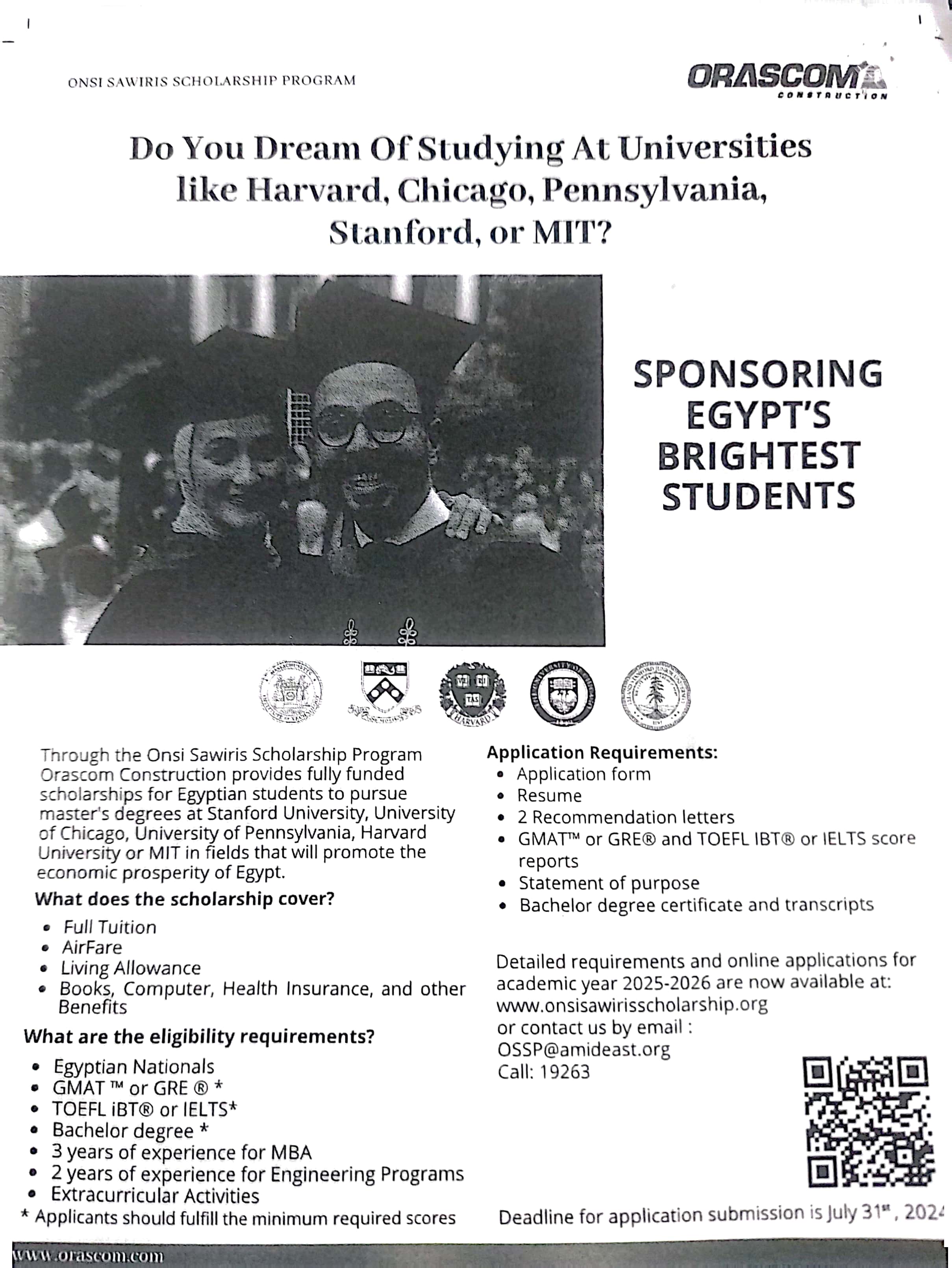 أعلنت الأمديست عن فتح باب التقديم لبرنامج منحة أنسي ساويرس الممولة بالكامل والتي تهدف الى منح الطلبة المصريين المتميزين الفرصة لدراسة البكالوريوس أو الماجستير في احدى الجامعات المتميزة بالولايات المتحدة الأمريكية . لمزيد من المعلومات https://www.onsisawirisscholarship.org/