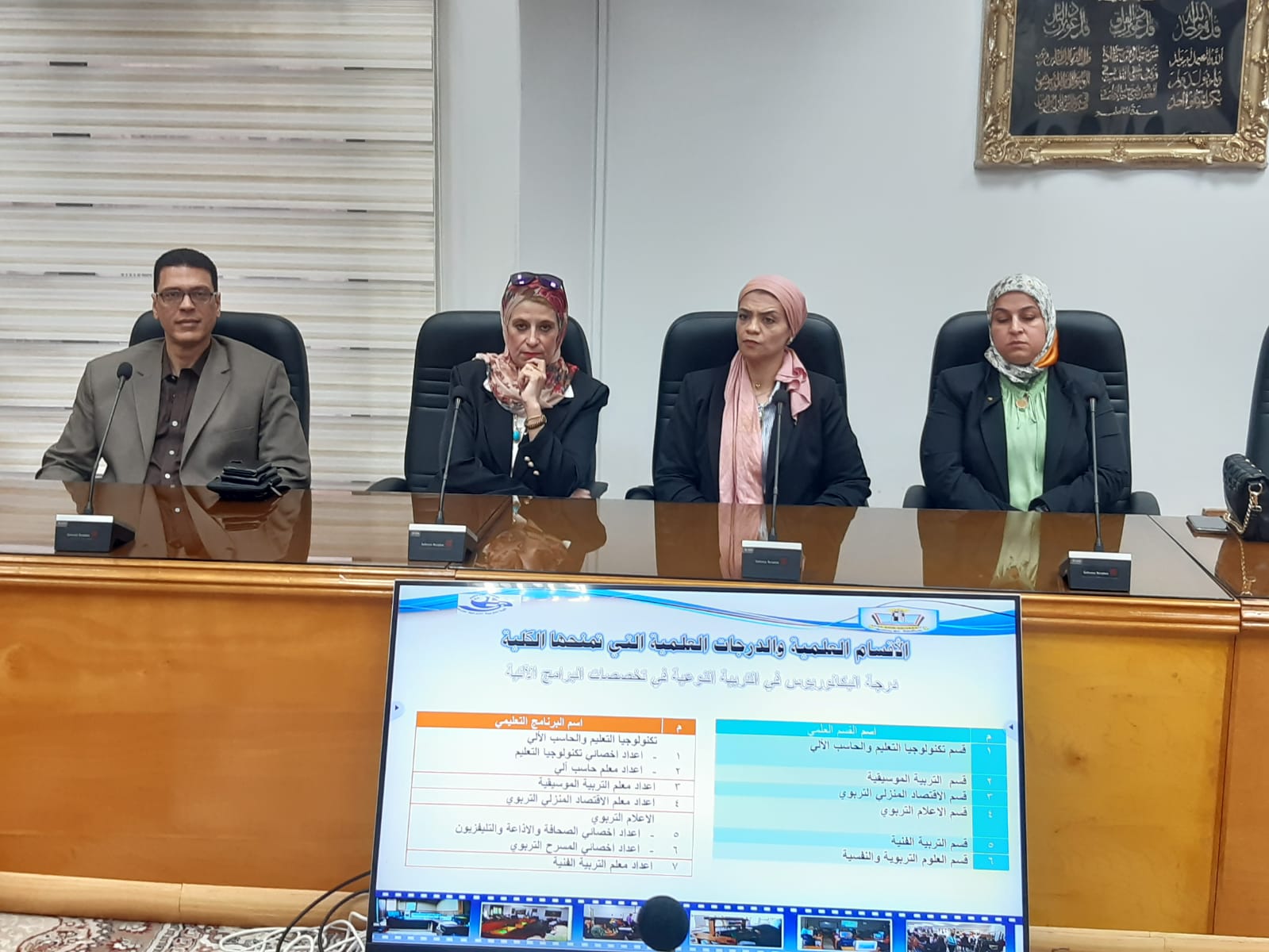 وبدأ الاجتماع حيث قام عميد كلية التربية النوعية بشرح نبذة عن تطور الكلية والتعرف على برامجها الحالية واقسامها العلمية والدرجات العلمية التى تمنحها الكلية وانشطة الكلية المختلفة داخل وخارج الكلية