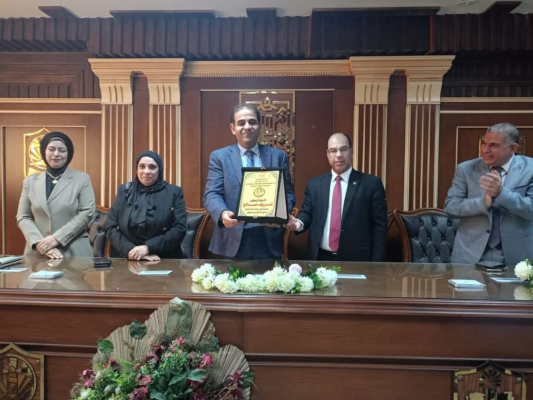 هذا وقد أهدى أ.د/ بدر عبد العزيز بدر – عميد كلية الآداب درع الكلية لمعالى رئيس الجامعة تقديراً لمجهود سيادته في العمل على تطوير الجامعة