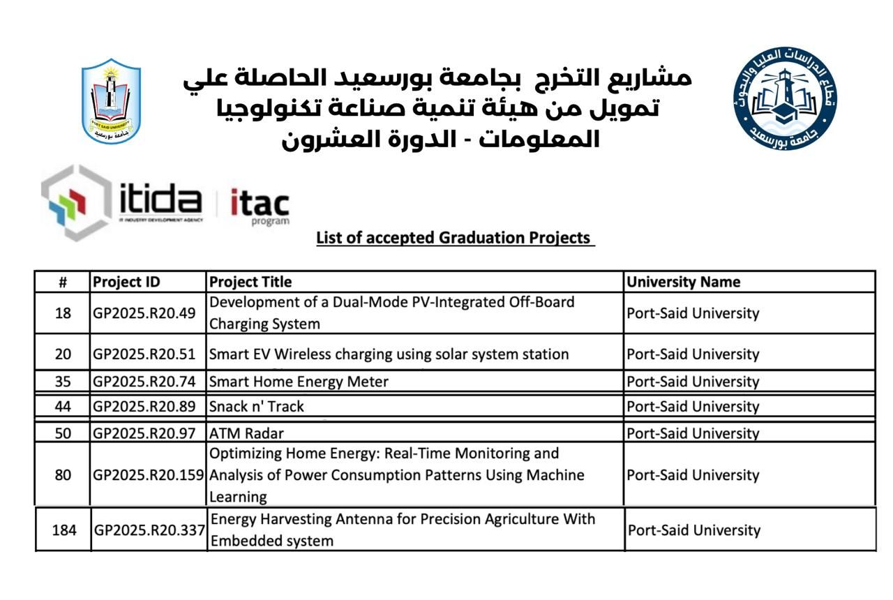 يُسعد قطاع الدراسات العليا والبحوث بجامعة بورسعيد أن يُعلن عن فوز ٧ مشاريع تخرج بتمويل من هيئة تنمية صناعة تكنولوجيا المعلومات (ITIDA) ضمن برنامج ITAC في دورته العشرون.