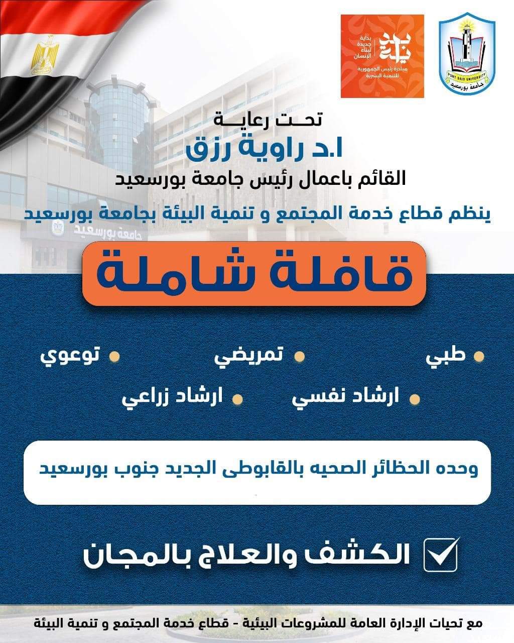 تحت رعاية السيد الأستاذ الدكتور راوية رزق القائم بعمل رئيس جامعة بورسعيد، يعلن قطاع خدمة المجتمع وتنمية بجامعة بورسعيد عن قافلة طبية شاملة وذلك الأحد القادم ٨ / ٩ / ٢٠٢٤.