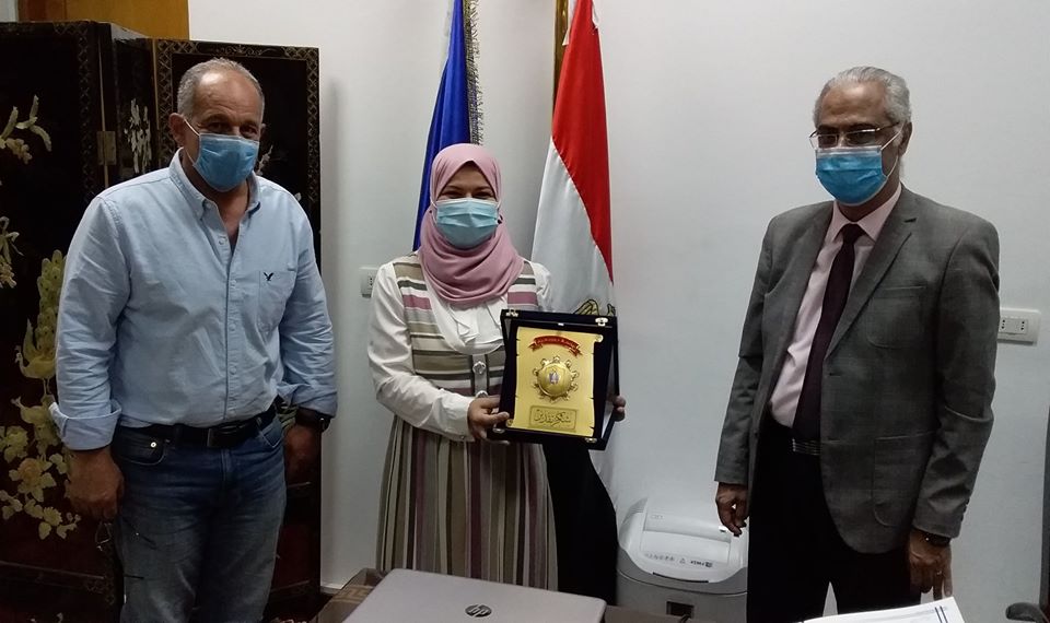 Le Dr Prof. Ayman Mohamed Ibrahim, président de l’université, décerne au Dr Manal Shalby, professeur de géographie à la faculté des arts, le bouclier universitaire à l’occasion de sa victoire du State Incentive Award. Le Dr Manal a présenté la recherche qui a remporté le prix et a expliqué son importance et les moyens de