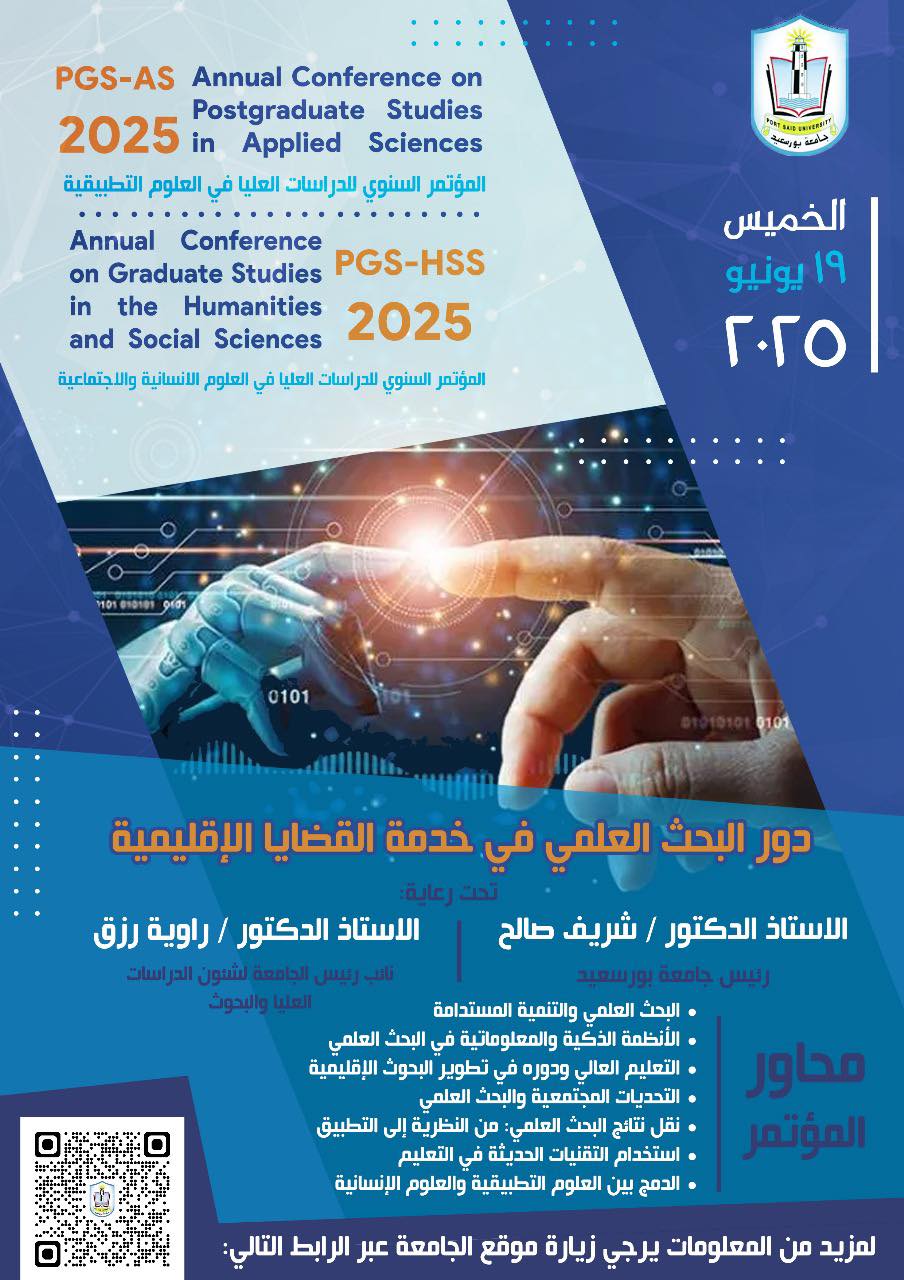 تحت رعاية الاستاذ الدكتور/ شريف صالح رئيس جامعة بورسعيد والاستاذ الدكتور / راوية رزق نائب رئيس الجامعة لشئون الدراسات العليا والبحوث يقام مؤتمر دور البحث العلمي في خدمة القضايا الإقليمية وذلك يوم الخميس الموافق 19 يونيو