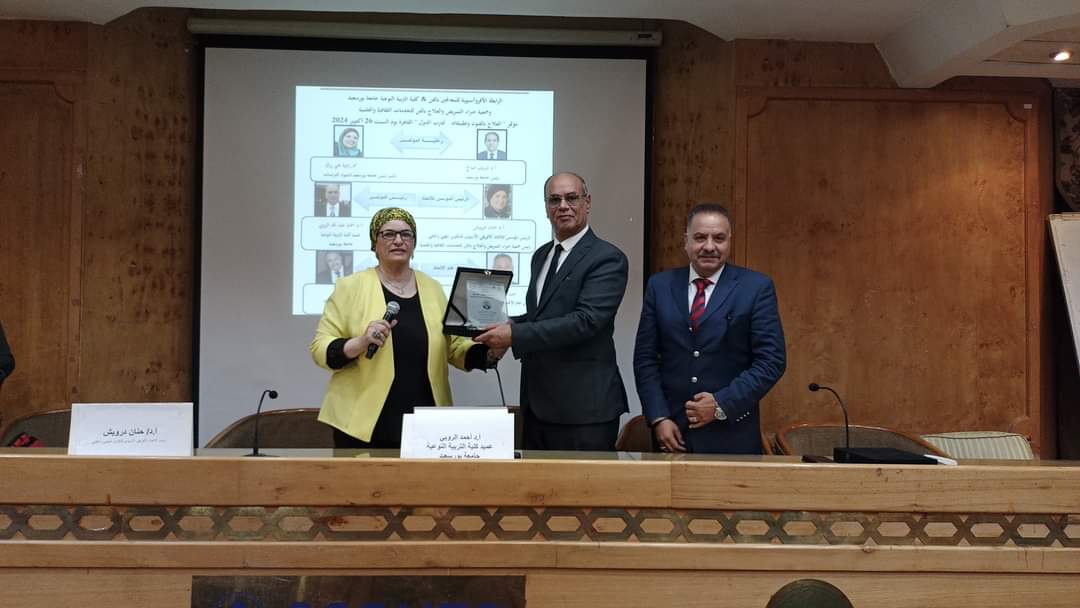 هذا وقد اهدى الاستاذ الدكتور/ احمد الروبى عميد كلية التربية النوعية ورئيس المؤتمر درع المؤتمر تكريما للسيد الاستاذ الدكتور / شريف صالح رئيس جامعة بورسعيد والاستاذة الدكتورة / راوية رزق نائب رئيس الجامعة لشئون الدراسات العليا والبحوث على دورهم فى دعم واقامة فاعليات المؤتمر حتى يخرج بنتائجه المرجوة والتى يمكنها التطبيق على ارض الواقع.