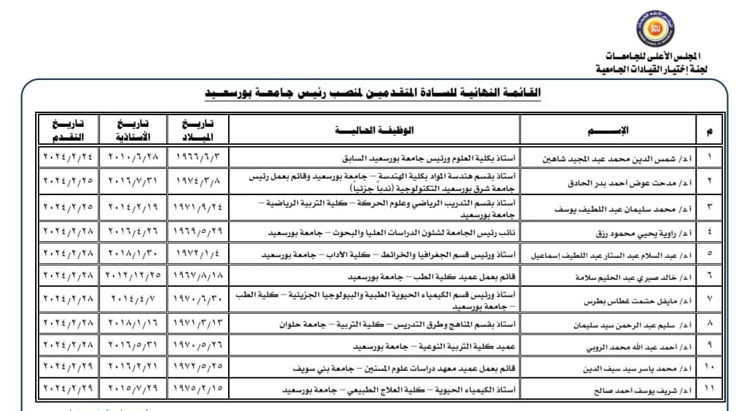 تقرر ان يكون موعد المقابلات للسادة المتقدمين للترشيح لمنصب رئيس جامعة بورسعيد يوم السبت 23/3/2024 بمقر أمانة المجلس الأعلى للجامعات وطبقا للقائمة النهائية التالية على ألا تزيد مدة العرض التقديمي لكل مرشح عن 10 دقائق.