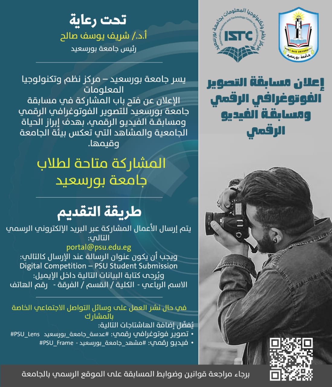 تسر جامعة بورسعيد – مركز نظم وتكنولوجيا المعلومات – الاعلان عن مسابقة التصوير الفوتوغرافي الرقمي ومسابقة الفيديو الرقمي بهدف إبراز الصورة الإيجابية للحياة الجامعية وإظهار مشاهد من الحرم الجامعي تعكس أنشطة الجامعة الأكاديمية والمجتمعية.