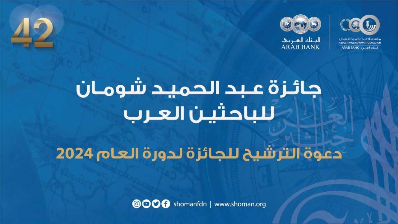 تعلن مؤسّسة عبد الحميد شومان عن فتح باب التقدّم لجائزة عبد الحميد شومان للباحثين العرب لدورة العام2024 (الدورة الـ 42) في 12 موضوعًا ضمن 6 حقول، والتي تبلغ قيمتها عشرين ألف دولار، وتمنح تقديرًا لنتاج علمي متميز في السنوات الخمس السابقة للترشح، يؤدي نشره وتعميمه إلى الزيادة في المعرفة العلمية والتطبيقية، والإسهام في حل مشكلات