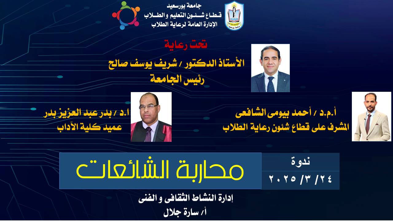 نظمت إدارة النشاط الثقافي و الفني بالجامعة ندوه عن محاربة الشائعات التي أقيمت بكلية الآداب بحضور طلاب الجامعة و ذلك يوم الاثنين الموافق ٣/٢٤ و حاضر بالندوه د/ دينا البرنس و تكلمت عن خطورة الشائعات و تأثيرها علي المجتمع