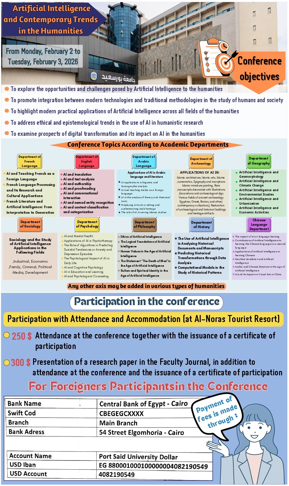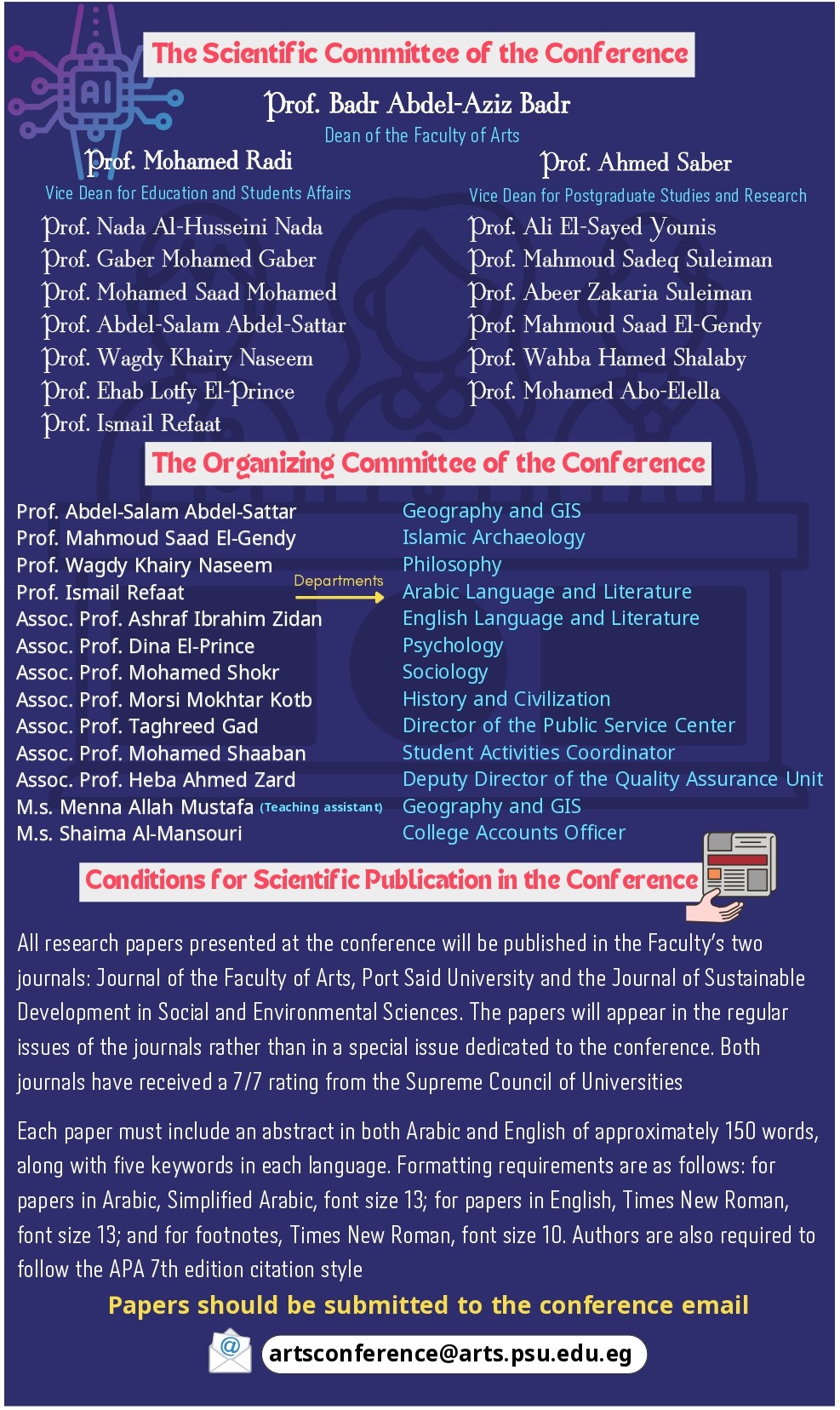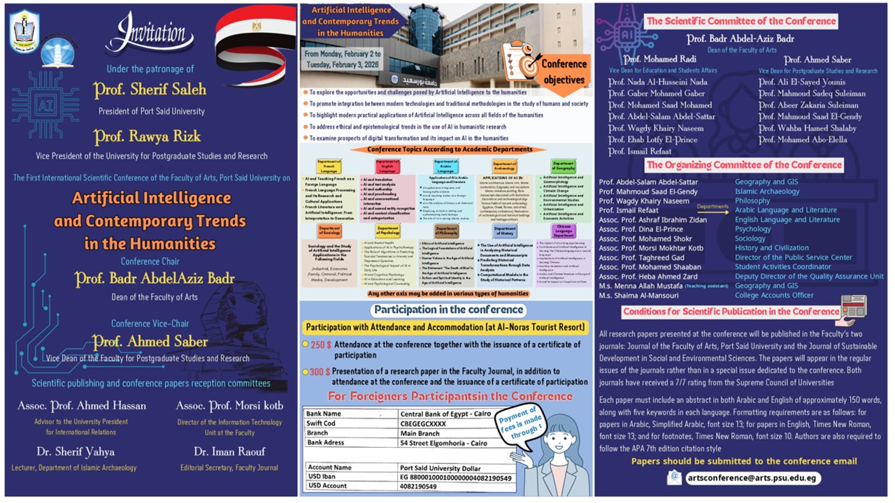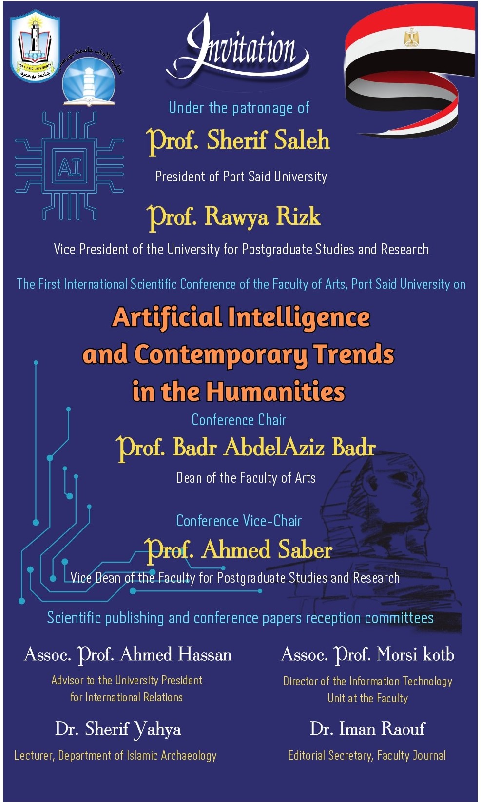 Under the auspice of Prof. Dr Sherif Saleh, President of Port Said University, Prof. Dr. Rawya Rizk, Vice President of the University for Postgraduate Studies and Research, the First International Scientific Conference of the Faculty of Arts is going to be held on Tuesday, February 3, 2026, on Artificial Intelligence and Contemporary Trends in the Humanities. Conference Chair Prof. Dr. Badr AbdelAziz Badr, Dean of the Faculty of Arts, Conference Vice-Chair, Prof. Ahmed Saber, Vice Dean of the Faculty for Postgraduate Studies and Research.
