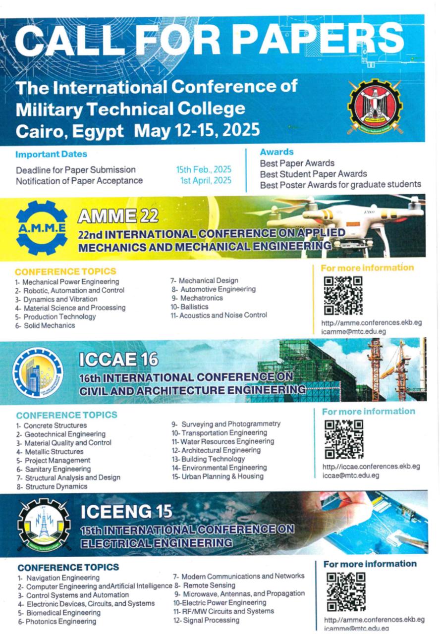 The Military Technical College announces the holding of the Annual International Conference of the Military College from May 12-15, 2025 at the college headquarters, which includes six specialized conferences: