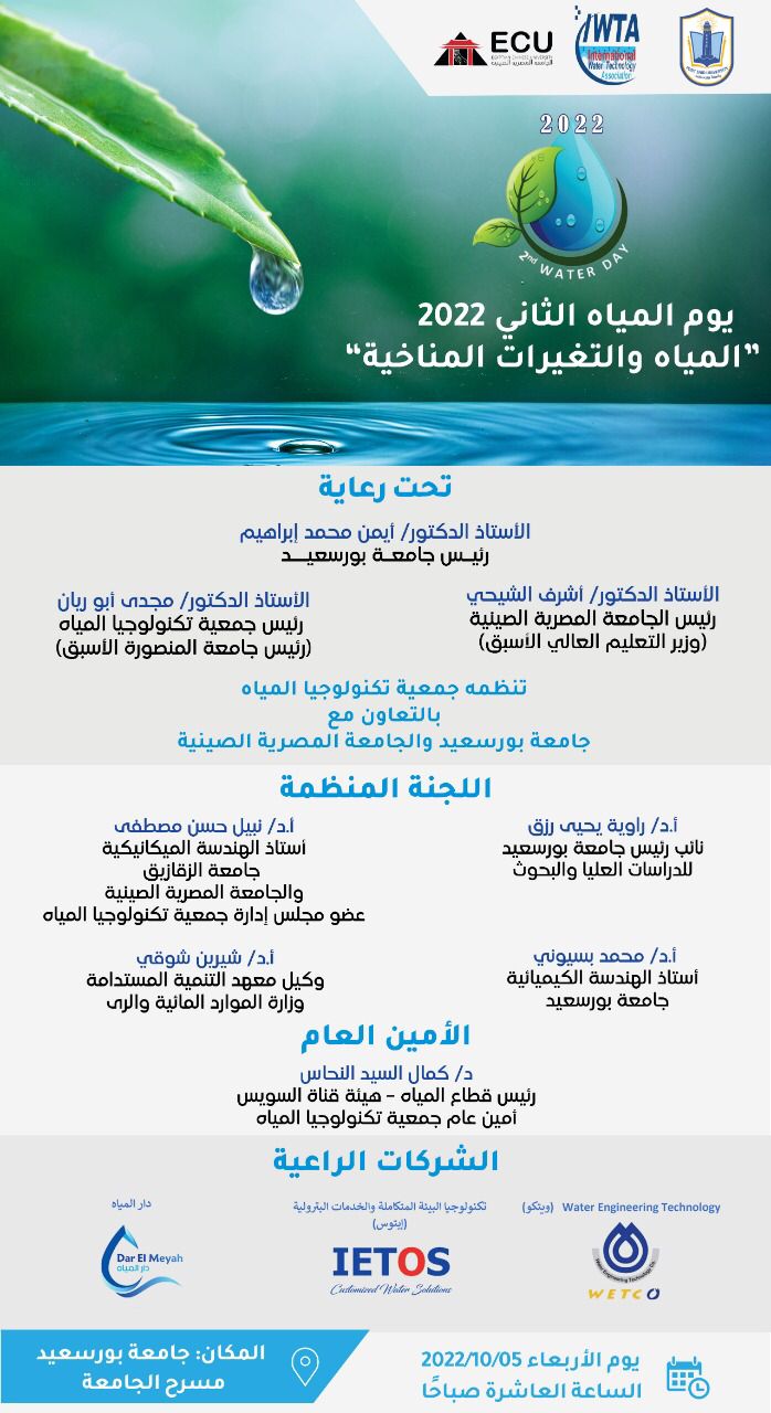 Under the auspice of Dr Prof. Ayman Mohamed Ibrahim, President of the University, and Dr Prof. Rawya Rizk – Vice President for Postgraduate Studies and Research, Port Said University announces the host of the second Water Day workshop 2022: Water and Climate Change. It will be launched at Port Said University on Wednesday 5/10/2022 At
