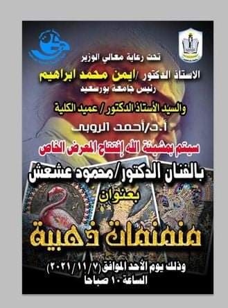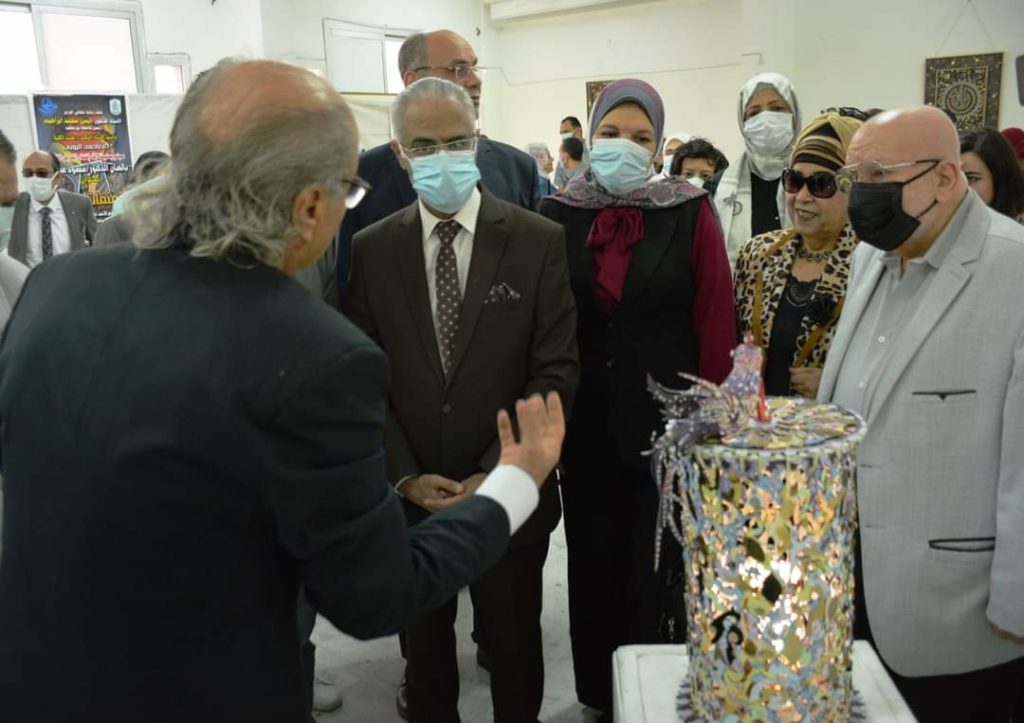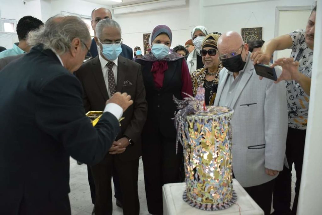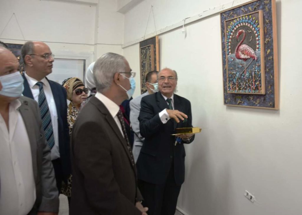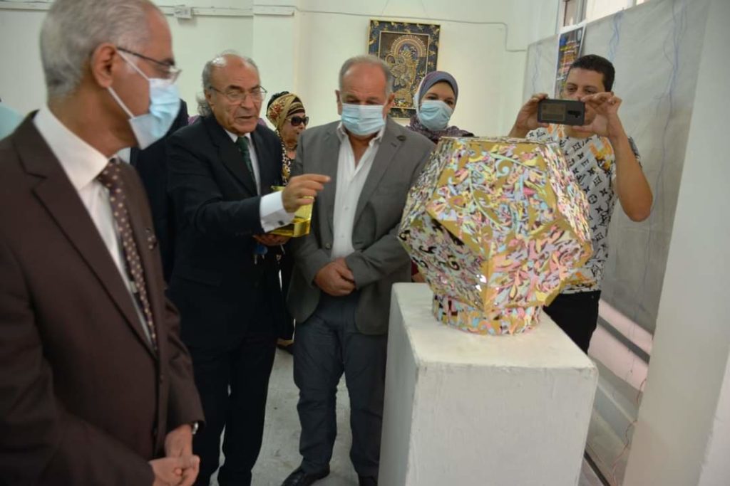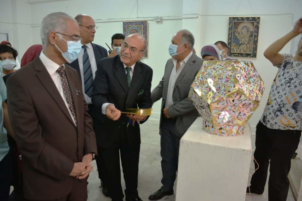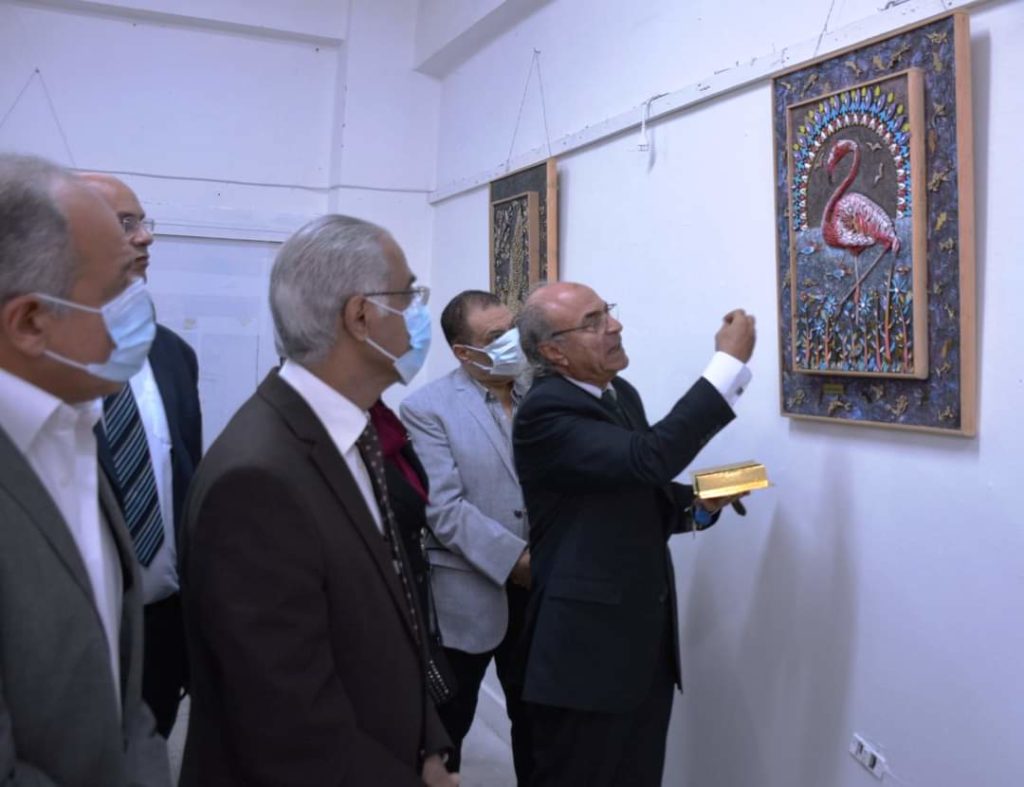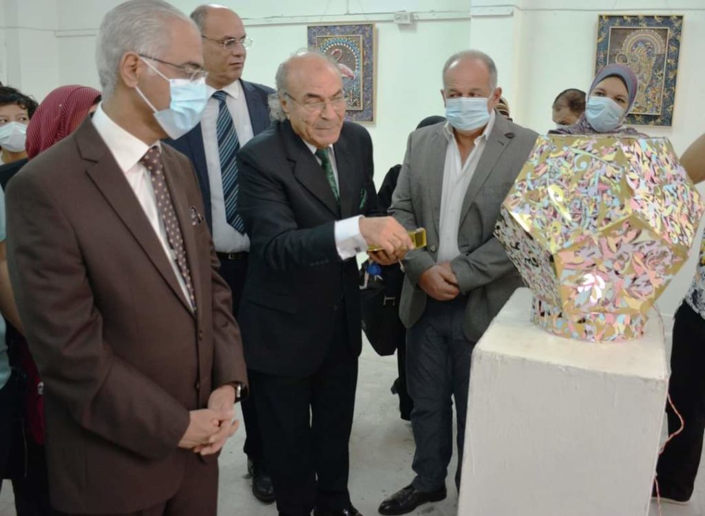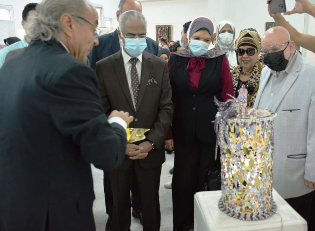 Under the auspice of Dr Prof. Ayman Ibrahim, president of the university, and Dr Prof. Ahmad el- Ruby, dean of the faculty of specific education, the art exhibition “Golden Miniatures” by Dr Mahmoud Ashash was inaugurated today, Sunday, November 7, 2021. The main idea of the exhibition is to recycle wood waste resulting from laser reloading; the artist adapted these remains into fine works of art. The inauguration of the exhibition was attended by Dr Prof. Galal Salem. Vice-president of education and students affairs, Dr Prof. Rawia Rizq, vice-president for postgraduate studies and scientific research, Dr Prof. Sherien el Desouqy, dean of the faculty of education, and a number of the university staff and interested in the fine works of art.