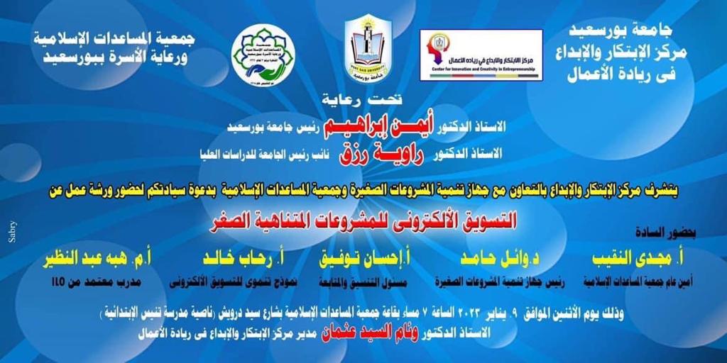 Within the framework of achieving the goals of the National Alliance for Civil Development, the Center for Entrepreneurship Innovation and Creativity at Port Said University launched an initiative in partnership with the Port Said civil society, in cooperation with the Small Enterprises Development Agency. The initiative provided a workshop entitled “Electronic Marketing for Micro Enterprises”. This is under the auspices of Prof. Dr Ayman Ibrahim – President of Port Said University and Prof. Dr Rawya Rizk – Vice President of the University for Postgraduate Studies, in the presence of: Prof. Dr Weam Othman – Director of the Center for Entrepreneurship Creativity and Innovation at Port Said University and Dr Wael Hamed – Head of the Enterprise Development Agency, and Mr. Magdy Al-Naqeeb – Secretary General of the Islamic Aid Society, Mr Sabri Al-Makawi – Secretary of the Islamic Association, Mr Sami Al-Rashidi – Vice President of the Islamic Association and a group of Port Said civil society members and faculty members at the university.