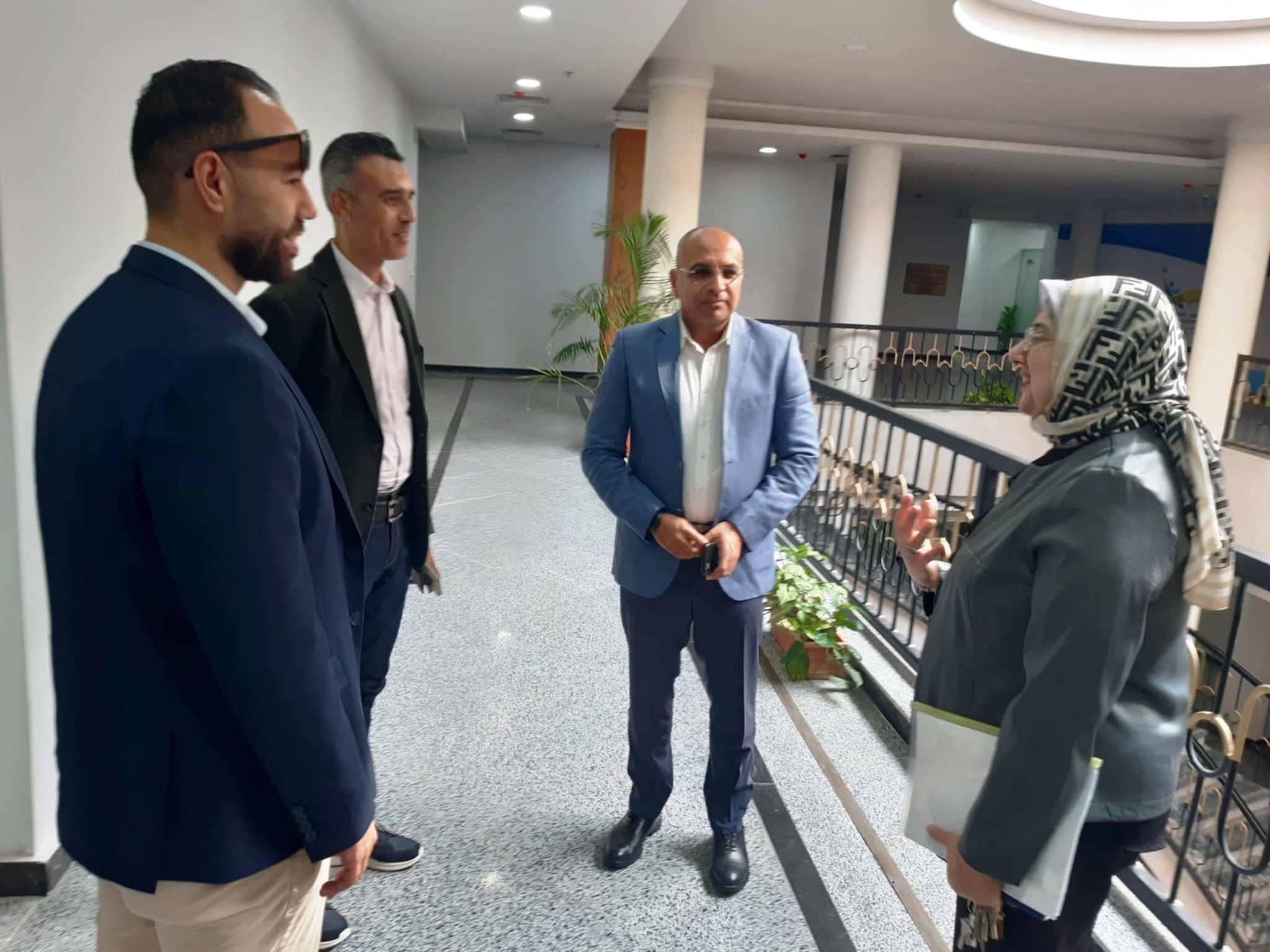 Prof. Dr. Sherif Saleh, President of Port Said University, received a delegation from the Suez Canal Container Terminal Company, headed by Mr. Mohamed Khattab, Head of Public and Governmental Relations, Mr. Sameh Haggag, Director of Human Resources, and Mr. Mustafa Abdel Latif, Director of Sustainable Development and Training. The meeting aimed to prepare for the signing of a cooperation protocol and strategic partnership between the two parties in the fields of training and community service.