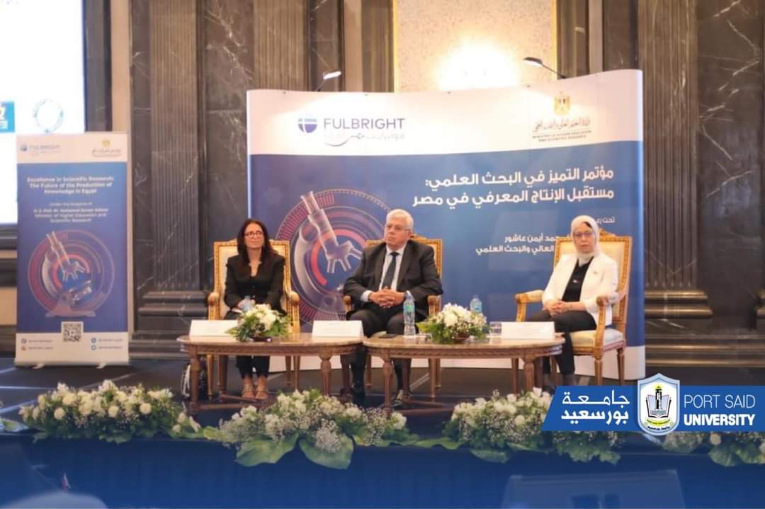 Port Said University, headed by Prof. Dr Ayman Ibrahim, participated with a high-level delegation in the Scientific Excellence Conference “Excellence in Scientific Research, the Future of Knowledge Production in Egypt”. The conference was held by the Ministry of Higher Education and Scientific Research and the Fulbright Commission in Egypt. This took place in the presence of Prof. Dr Mohamed Ayman Ashour, Minister of Higher Education and Scientific Research, Maggie Nassif, Executive Director of the Fulbright Commission, and Dr Yasser Refaat, Deputy Minister for Scientific Research Affairs, and a group of heads of universities, research centers and leaders of higher education. The conference also witnessed the attendance of Mustafa Refaat, Secretary of the Supreme Council of Universities, Dr. Walaa Sheta, CEO of the Science, Technology and Innovation Finance Authority, Dr Abeer Al-Shater, Assistant Minister for Technical Affairs and Supervisor of the Egyptian Knowledge Bank. And a number of prominent Egyptian scientists and researchers in their fields of specialization and researchers included in the international Stanford list. The conference was held at the St. Regis Hotel in the New Administrative Capital.