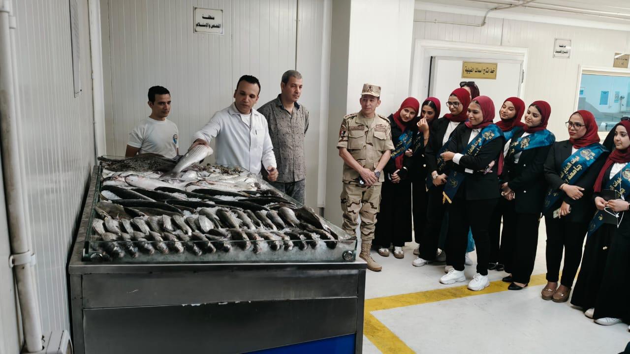 As part of the program of visits organized by the Popular Defense Command for Egyptian university students to national projects, the General Administration for Student Welfare, in cooperation with the Military Education Department at Port Said University, participated in a visit to the Al-Fayrouz fish farms. The visit aimed to familiarize students with the state’s efforts in supporting food security and strengthening the national economy.