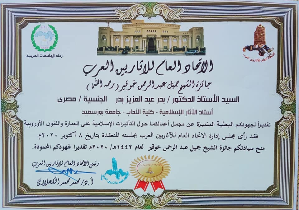 In The Arab Archaeologists Conference 23rd Dr Prof. Badr Abdul Azizi, dean of the faculty of Arts won the Sheikh / Jamil Abdul Rahman Khuqeer award. The conference was attended by Dr Amr Ezzat Salama, head of the Arab Universities Union, Dr Prof. Ayman Ibrahim, president of the university, Dr Prof. Mohamed Ibrahim, ex- minister of Antiques, Dr Prof. Mohamed el- Kahlawy, head of the Arab Archeologists Union, and a number of professors of archeology in the Arab World.