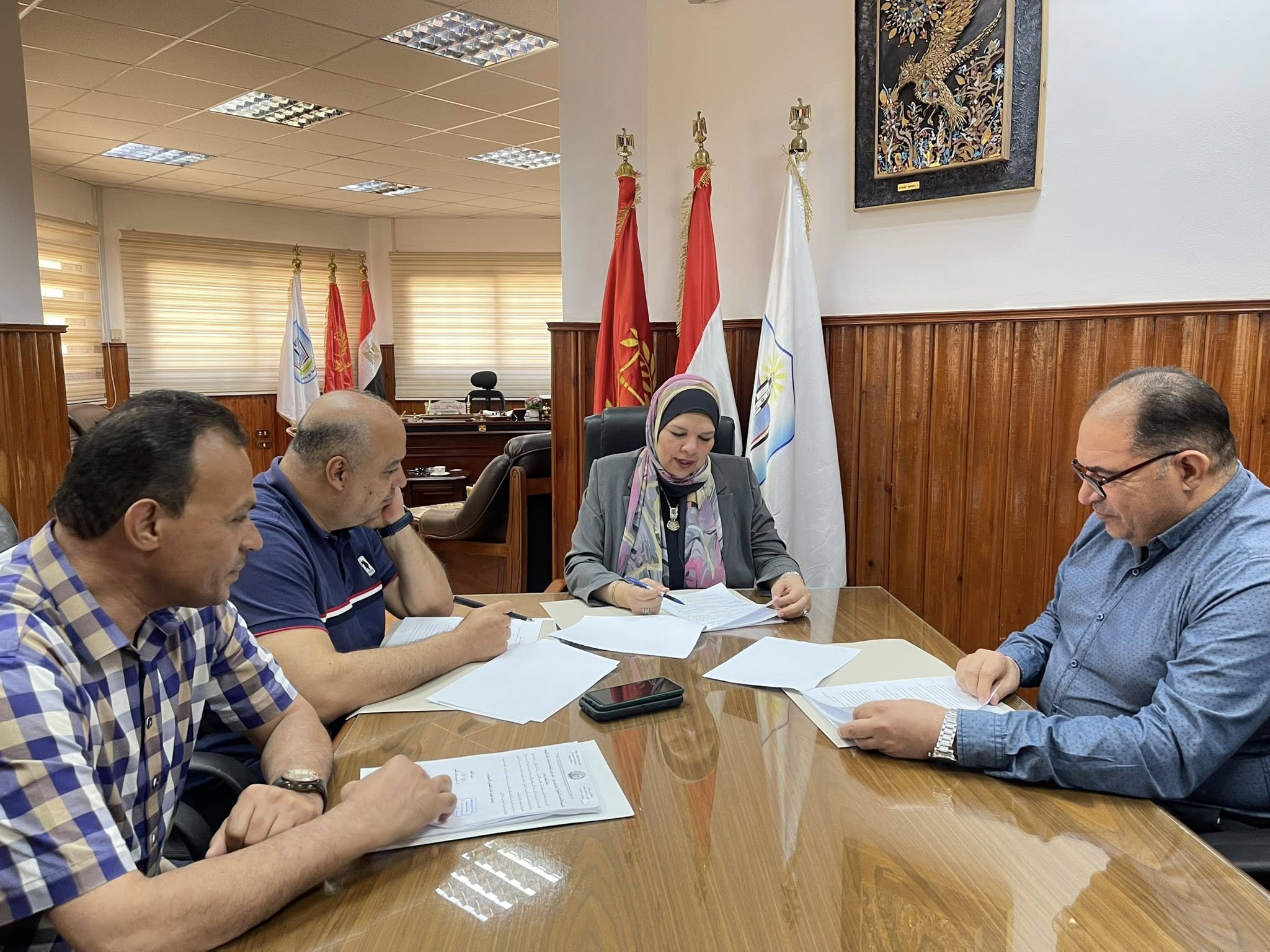 The Central Committee for Examining Faculty Objections regarding the decisions of the Standing Academic Committees for Promotion convened, chaired by Prof. Rawya Rizq, Vice President for Graduate Studies and Research, and attended by Prof. Ahmed Mohamed Abdelkader, Dean of the Faculty of Sports Sciences; Professor Taha Farag, Dean of the Faculty of Engineering; and Prof. Osama El-Tabai, Director General of Legal Affairs at the University.