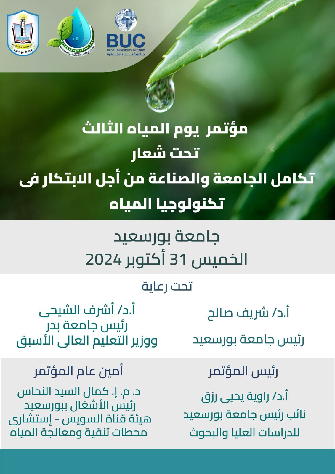 تعلن جامعة بورسعيد عن مؤتمر “تكامل الجامعة والصناعة من أجل الابتكار في تكنولوجيا المياه” وذلك يوم الخميس الموافق ٣١ أكتوبر ٢٠٢٤.