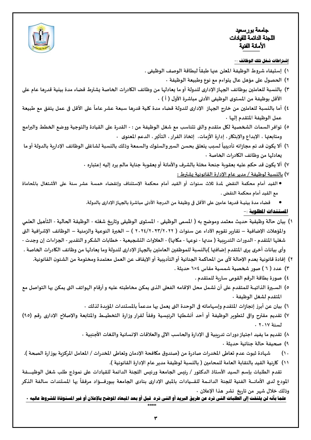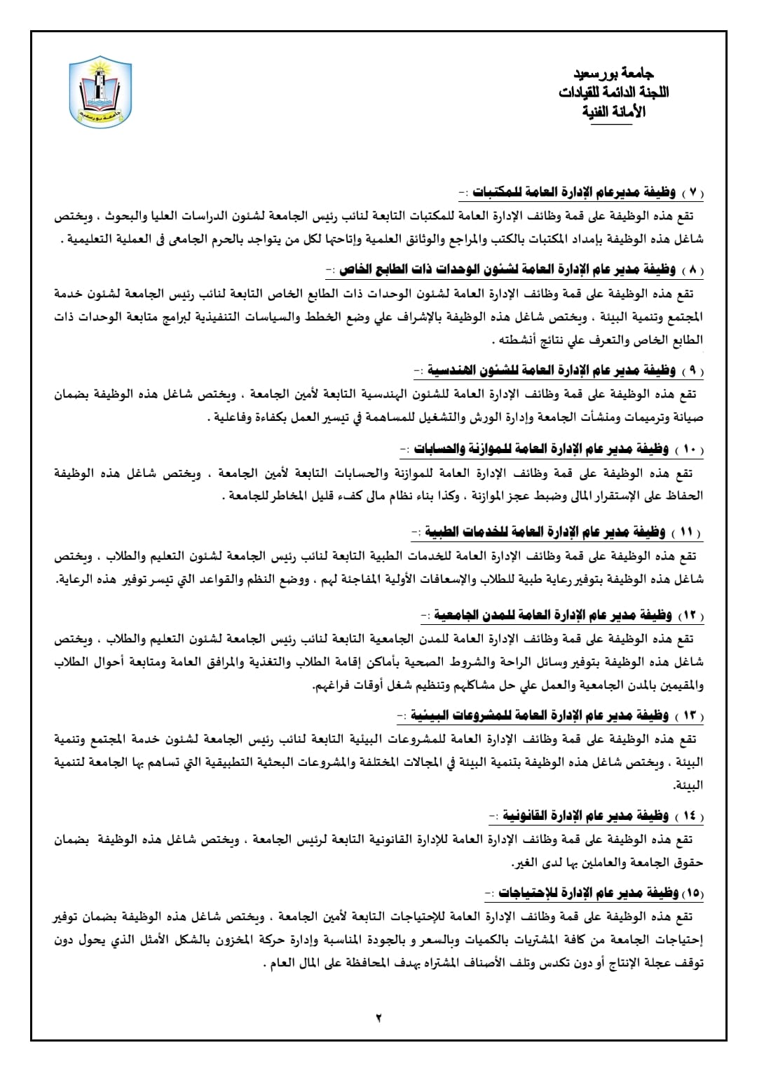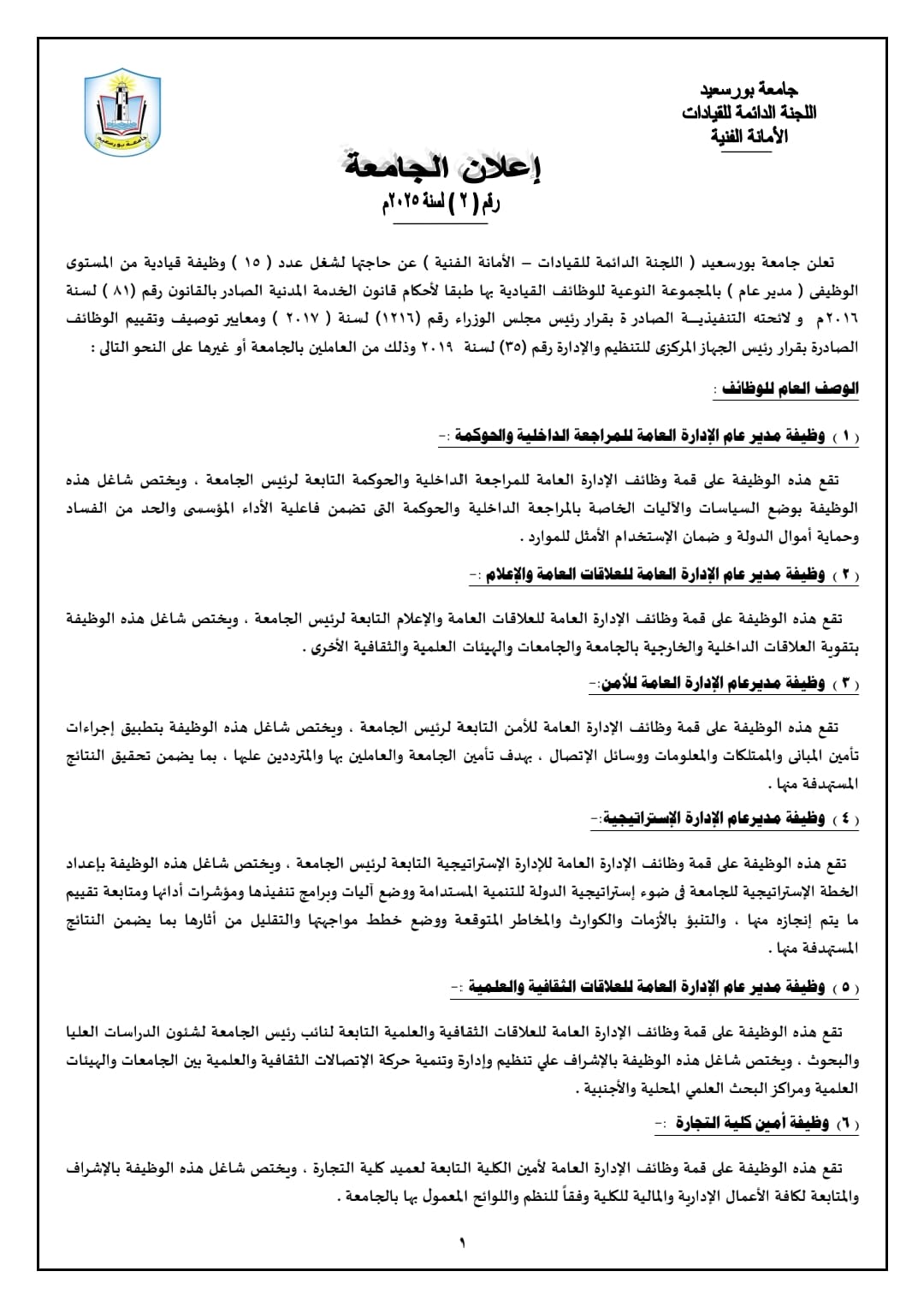 تعلن جامعة بورسعيد ( اللجنة الدائمة للقيادات – الأمانة الفنية ) عن حاجتها لشغل عدد ( 15 ) وظائف قيادية من المستوى الوظيفي ( مدير عام ) بالمجموعة النوعية التخصصية للوظائف القيادية بها طبقا لأحكام قانون الخدمة المدنية وذلك من العاملين بالجامعة أو غيرها على النحو التالي: