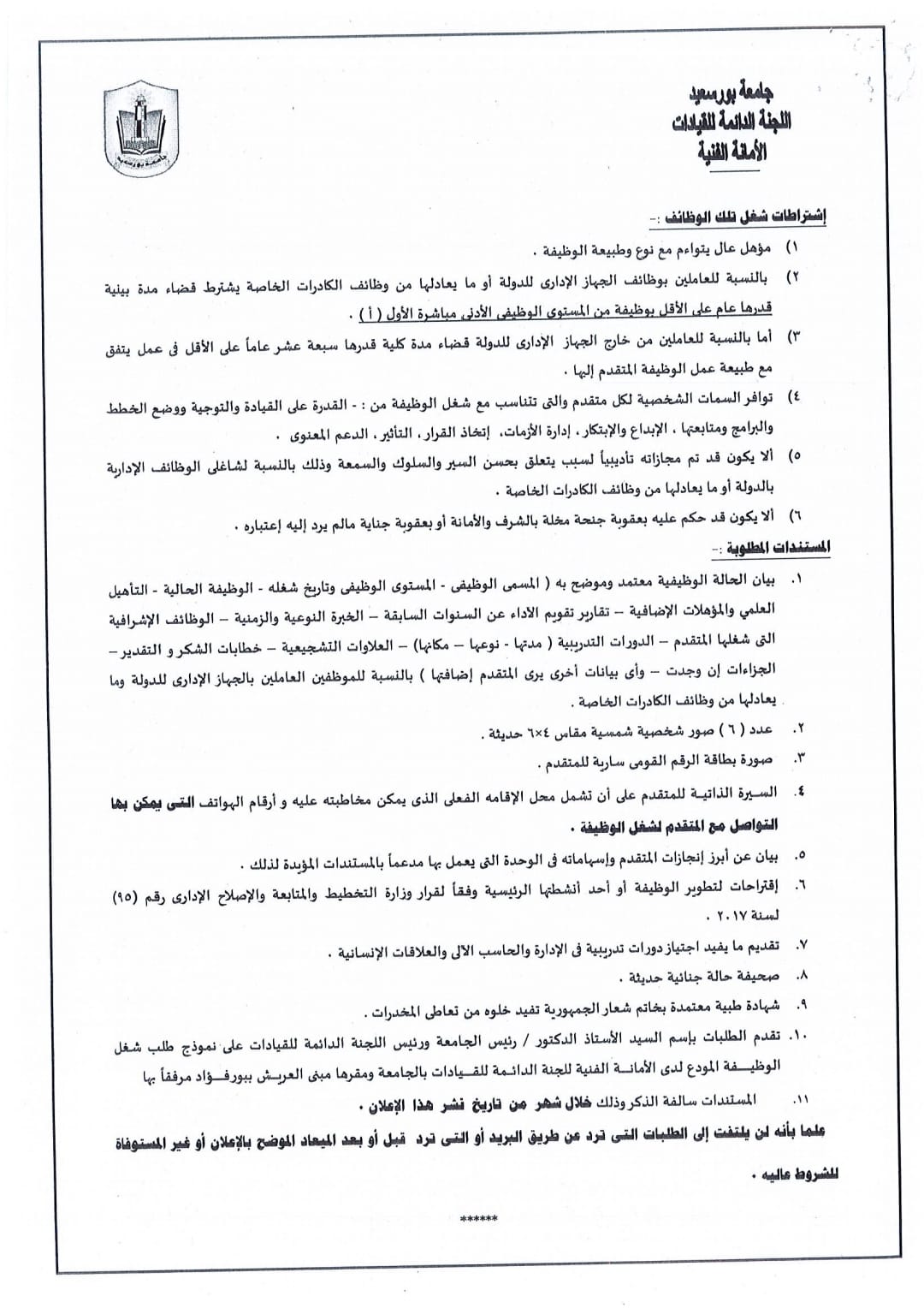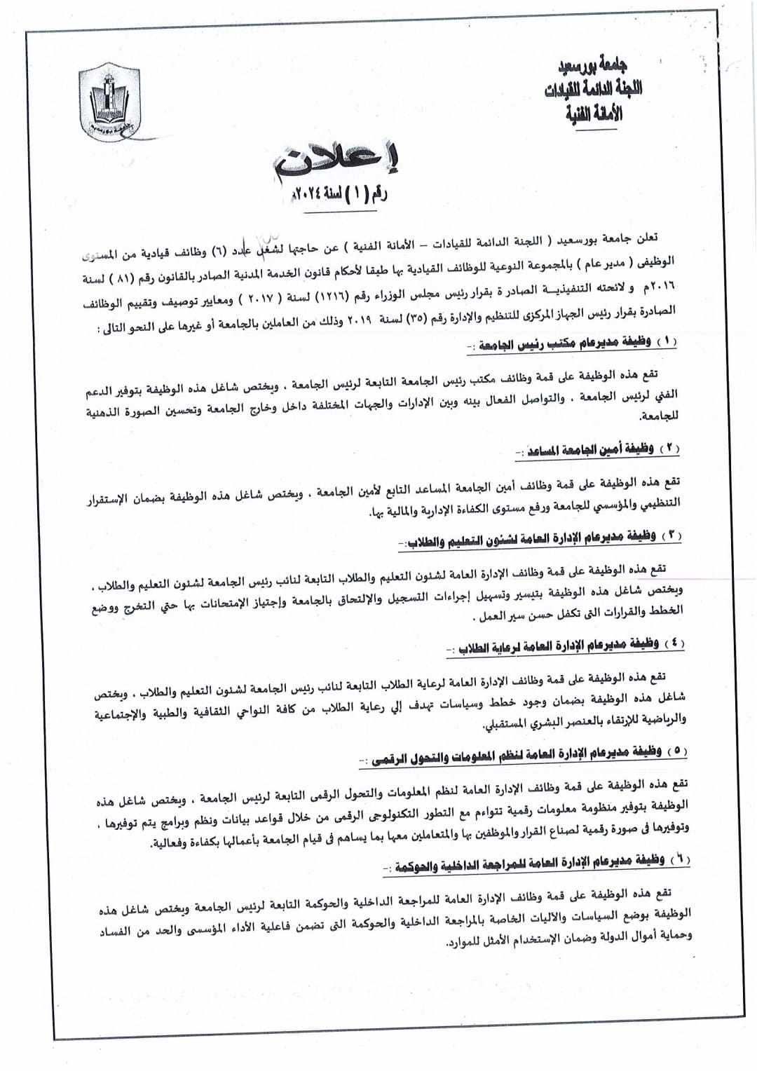 تعلن جامعة بورسعيد ( اللجنة الدائمة للقيادات – الأمانة الفنية ) عن حاجتها لشغل عدد ( ٦ ) وظائف قيادية من المستوى الوظيفي ( مدير عام ) بالمجموعة النوعية التخصصية للوظائف القيادية بها طبقا لأحكام قانون الخدمة المدنية وذلك من العاملين بالجامعة أو غيرها على النحو التالي:
