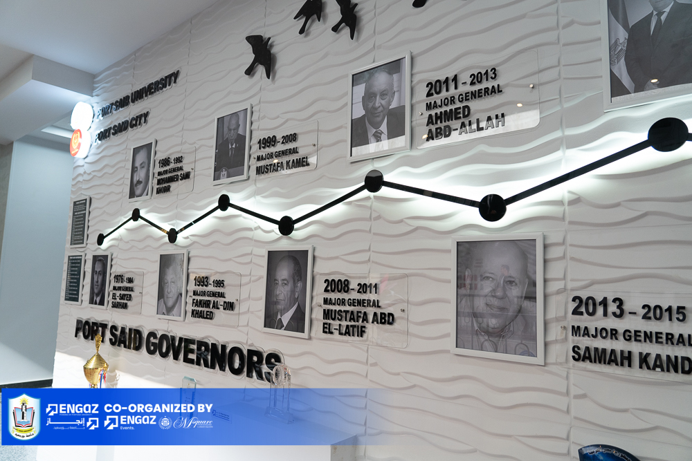 الجدار الثاني يوثق السادة وزراء التعليم العالي ورؤساء جامعة بورسعيد الذين تم تعيينهم بقرارات جمهورية، في سجل تاريخي يربط الحاضر بجذور المؤسسة.