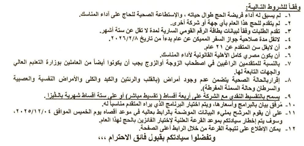 تُعلن جامعة بورسعيد، في إطار التنسيق المستمر مع وزارة التعليم العالي والبحث العلمي، عن بدء تلقي رغبات السادة المتقدمين لأداء فريضة الحج للموسم ( 1447هـ/2026م)، وفقاً للتخصيص الوارد من الوزارة.