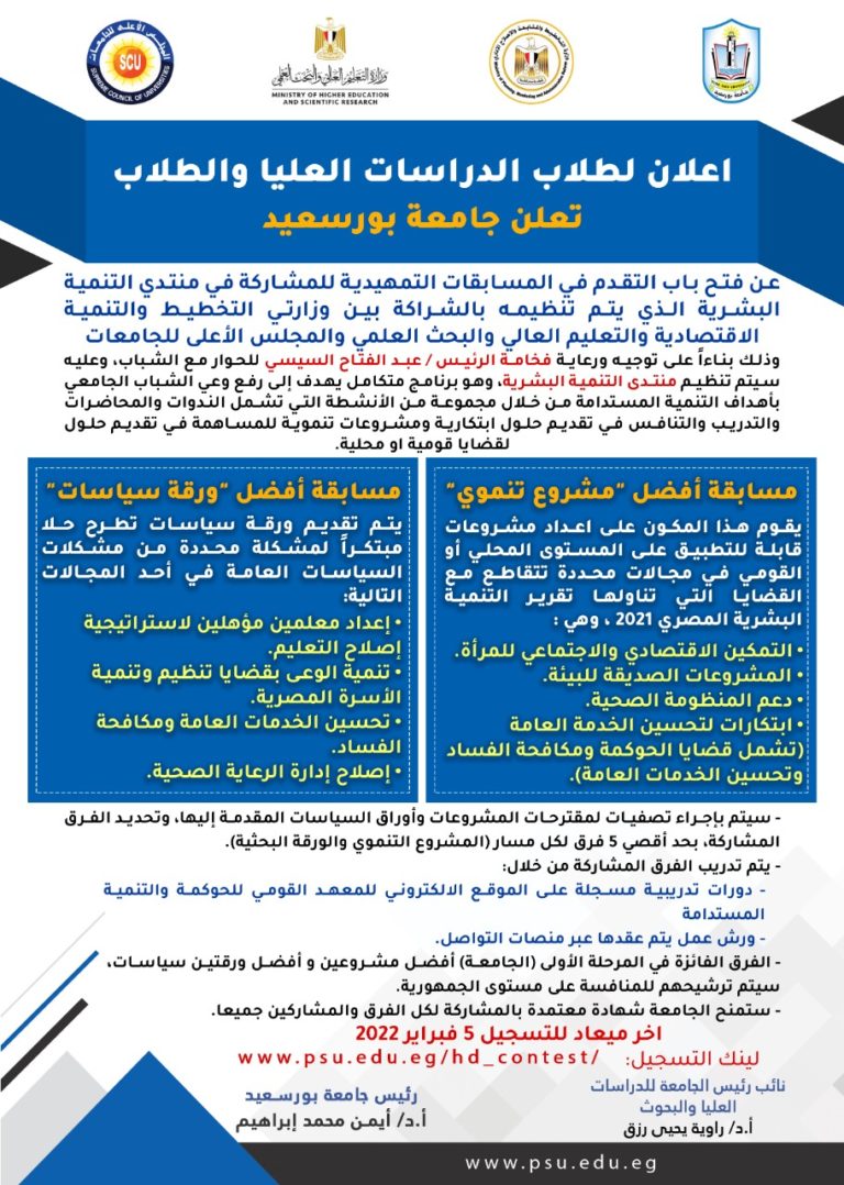 فعاليات الطلاب فبراير 21, 2025أنتظروا الحدث السنوى الكبير ليوم هندسة بورسعيد الاثنين القادمنوفمبر 27, 2024يعلن صندوق رعاية المبتكرين والنوابغ عن فتح باب التقدم في برنامج eGP 2025ديسمبر 17, 2023انعقاد البرنامج التدريبي الأول لسفراء الحوكمةمايو 5, 2023للطلاب المهتمين بمجال التكنولوجيا وبناء وتطوير المهارات لسوق عمل المستقبلديسمبر 8, 2022فتح باب التقدم في المسابقات التمهيدية للمشاركة في منتدي التنمية البشريةنوفمبر 24, 2022مؤتمر ومعرض القاهرة الدولي للتكنولوجيا Cairo ICTنوفمبر 20, 2022Green not Grey الفعالية 13 ليوم هندسة بورسعيدنوفمبر 17, 2022ندوة تعريفية لشرح جميع التطبيقات المقدمة من شركة مايكروسوفتأبريل 26, 2022ورش عمل بنك المعرفة المصري للفترة من ٢٦ أبريل إلى ٢ مايو