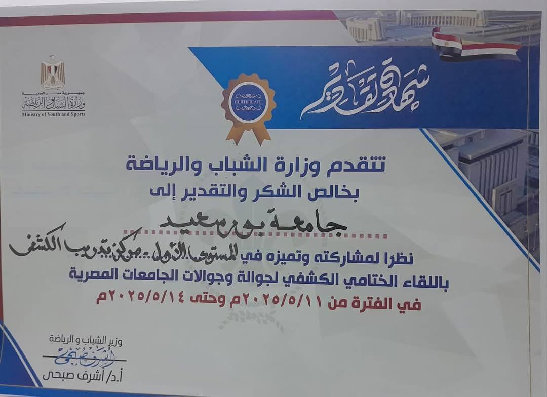 كما فازت الجامعة بجائزة المشرف المثالي علي مستوي اللقاء و شهادة تقدير لجامعة بورسعيد و اعضاء المركز الكشفي